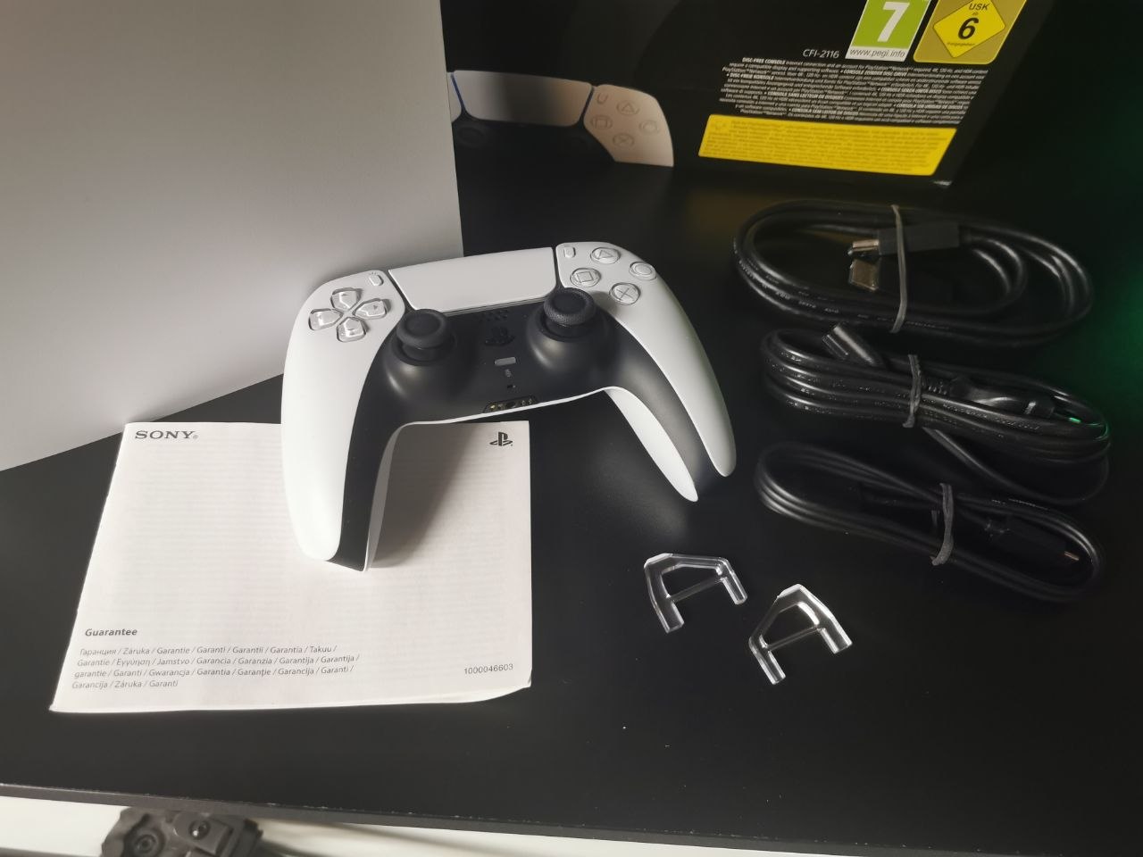 W zestawie: konsola, kontroler, komplet kabli, para podstawek oraz karta gwarancyjna. Brak instrukcji obsługi